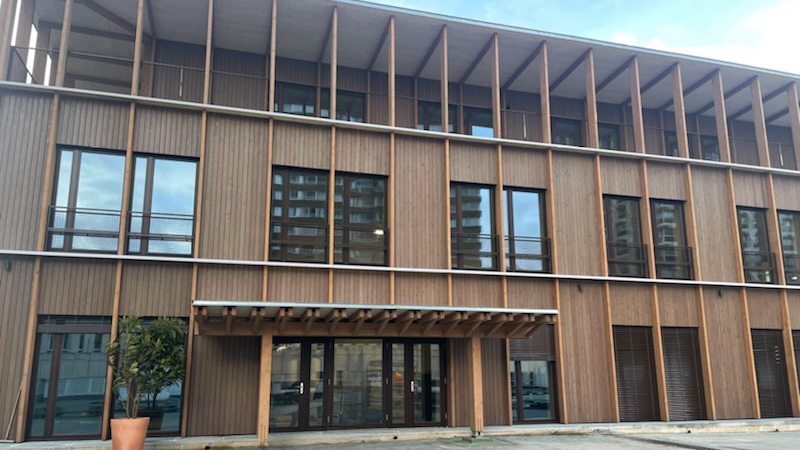 ▶️ L’enveloppe en bois pré grisé pour des questions de durabilité, assure une forte inertie ce qui en fait un bâtiment quasiment passif.